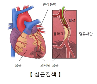 관상 동맥은 심장에 산소와 영양분을 공급하여 심장의 기능을 유지하는 혈관입니다. 심근경색증은 관상동맥이 막힘으로써 그 혈관이 공급하는 심장 근육이 손상을 입는 상태를 말합니다. 산소 공급이 중단되면 수 분 내지 수 십분 이내에 심장 근육 세포는 괴사를 일으키게 됩니다. 이런 혈액 공급의 중단은 흉통과 심장 수축 기능의 저하, 부정맥 등의 합병증을 일으킬 수 있으며 즉각적이며 적절한 치료가 이루어지지 않으면 심각한 결과를 초래할 수 있습니다.일단 환자가 흉통을 호소해 응급실로 오면 심전도와 기본적인 혈액 검사를 시행하여 확인하게 됩니다. 심근 경색이 의심이 되면 여러 가지의 약물이 주입되게 되고, 심장 초음파 검사 등이 행해지며, 환자의 상태에 따라 치료를 결정하게 됩니다. 주로 3가지 치료 방법이 있는데, 약물(혈전 용해제)을 이용한 방법 또는 풍선 및 스텐트를 이용한 관상동맥 중재시술(관동맥 확장 성형술 및 스텐트 삽입술)로 막힌 혈관을 뚫어 주는 방법이 있습니다. 이 때 중요한 점은 이 시술이 최대한 빨리 시행되어야 한다는 점입니다. 그 외에 관상동맥 우회술이라는 수술적 방법도 있습니다.